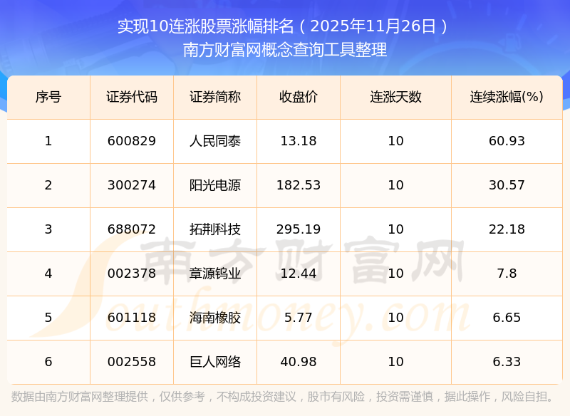 根據(jù)南方財(cái)富網(wǎng)概念查詢工具數(shù)據(jù)統(tǒng)計(jì),截止2025年11月26日收盤,共有6只個股實(shí)現(xiàn)10天連漲。其中連續(xù)漲幅較大的個股有人民同泰、陽光電源、拓荊科技等,連續(xù)漲幅分別為60.93%、30.57%、22.18%。