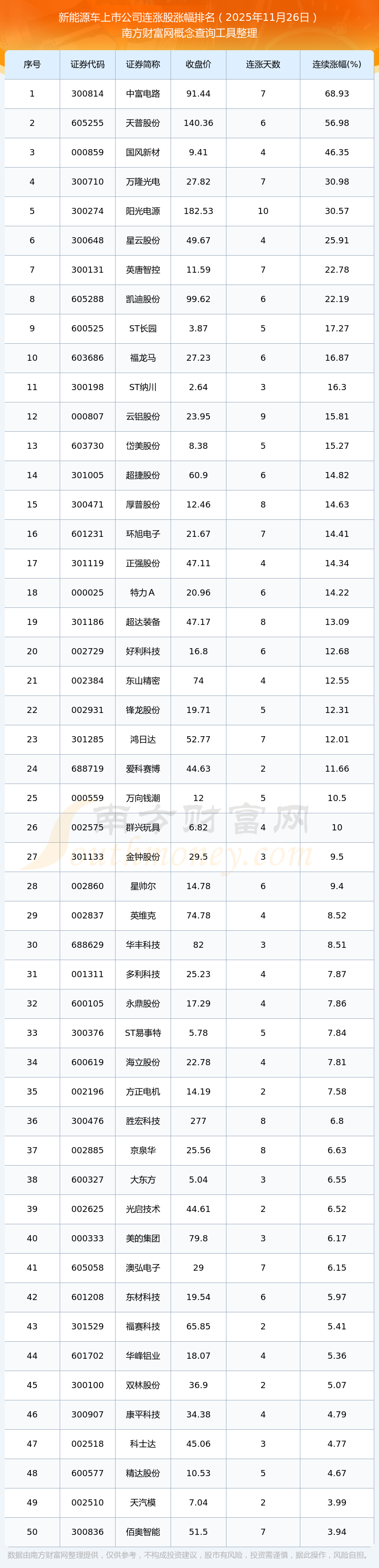 根據(jù)南方財富網(wǎng)概念查詢工具數(shù)據(jù)統(tǒng)計,截止2025年11月26日收盤,新能源車上市公司共有138只個股實現(xiàn)連漲。其中連續(xù)漲幅較大的個股有中富電路、天普股份、國風新材等,連續(xù)漲幅分別為68.93%、56.98%、46.35%。