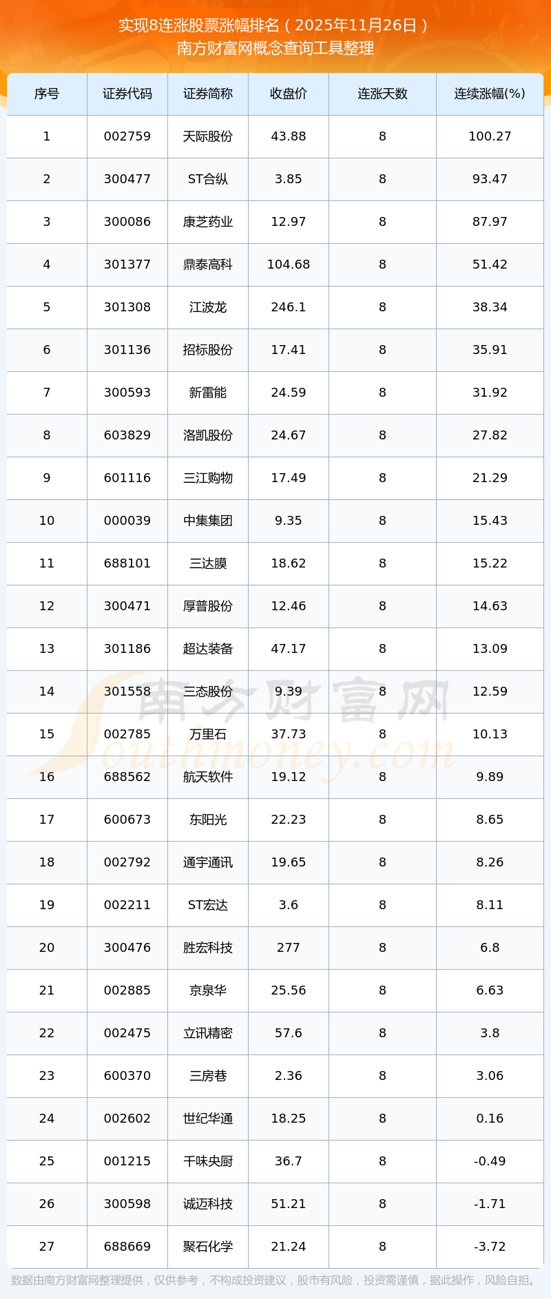 2025年11月26日實(shí)現(xiàn)8連漲股票漲幅排名