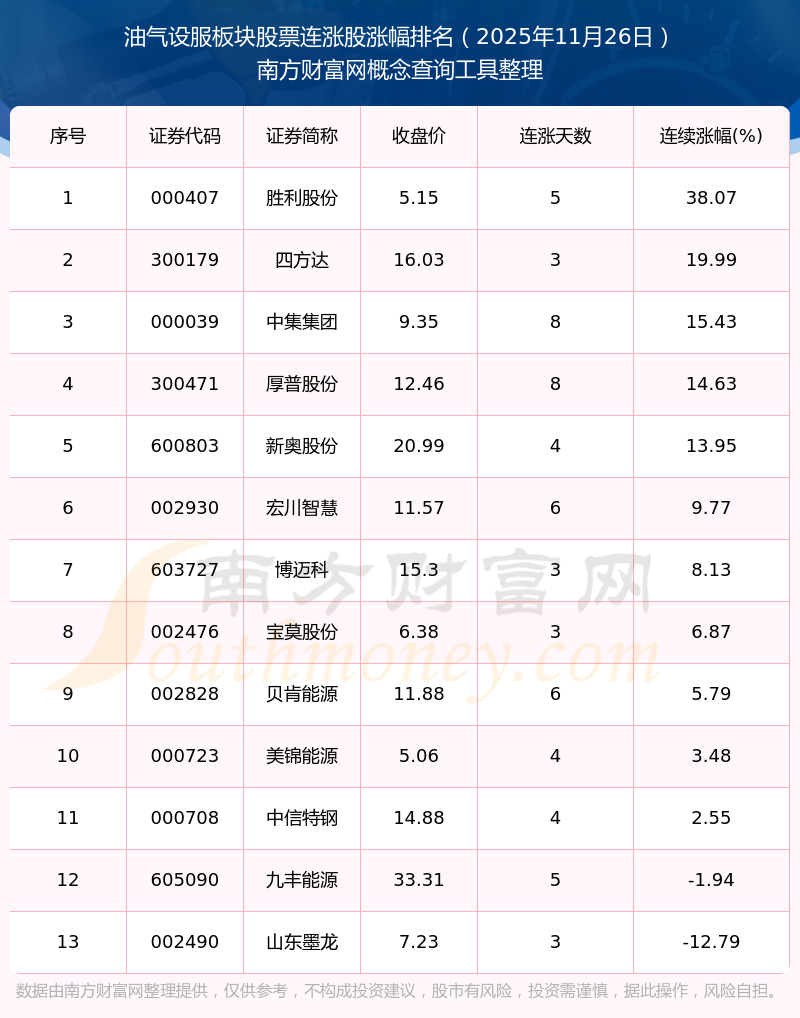 2025年11月26日油氣設(shè)服板塊股票連漲股漲幅排名