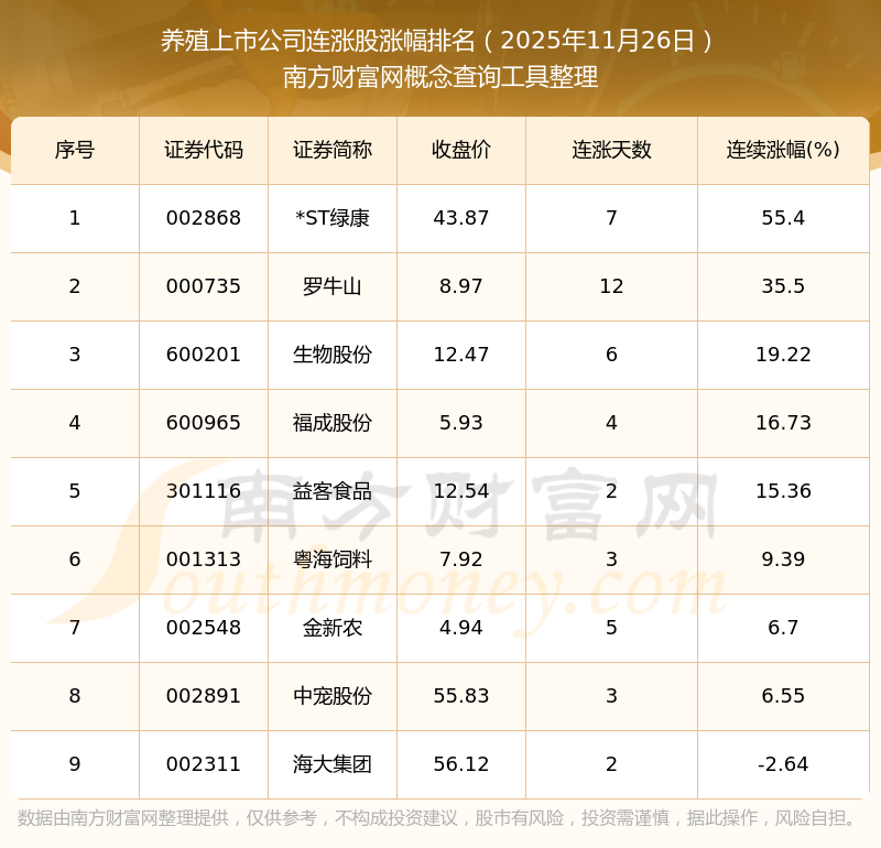 2025年11月26日養(yǎng)殖上市公司連漲股漲幅排名