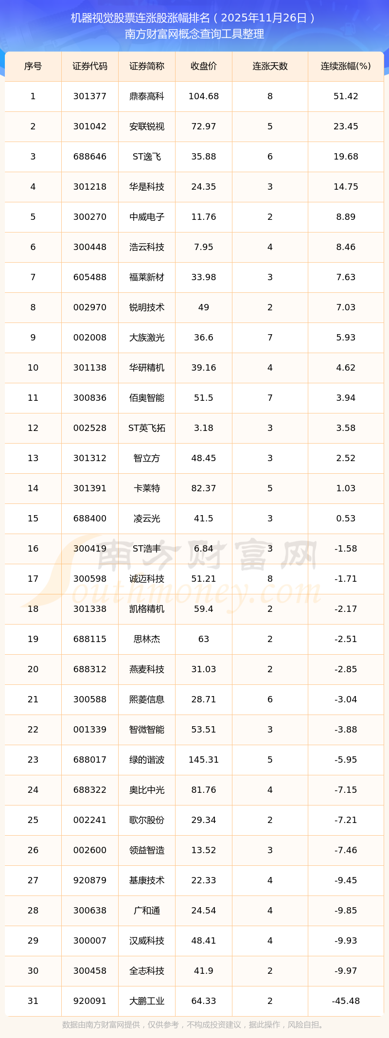 2025年11月26日機(jī)器視覺(jué)股票連漲股漲幅排名