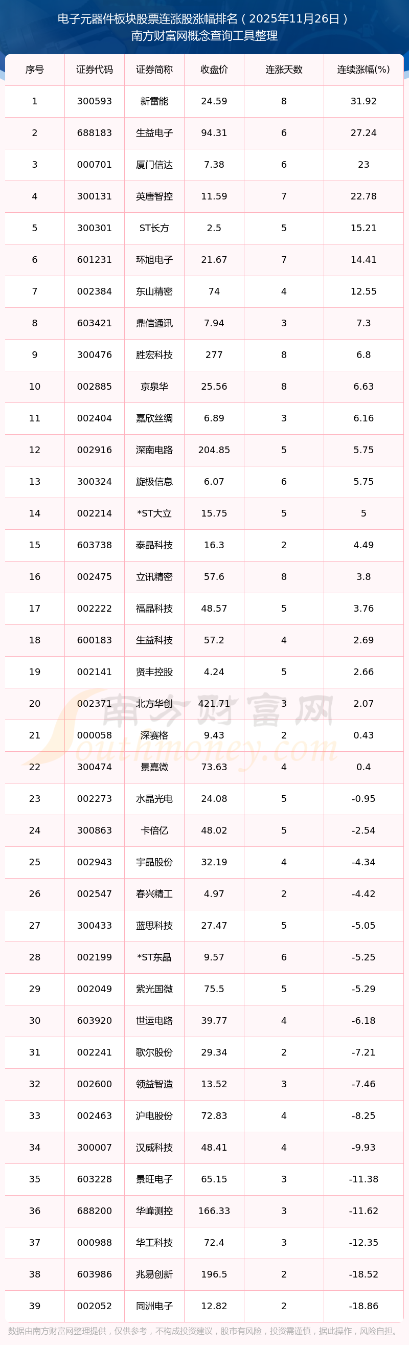 2025年11月26日電子元器件板塊股票連漲股漲幅排名
