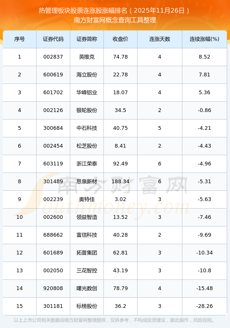 2025年11月26日熱管理板塊股票連漲股漲幅排名