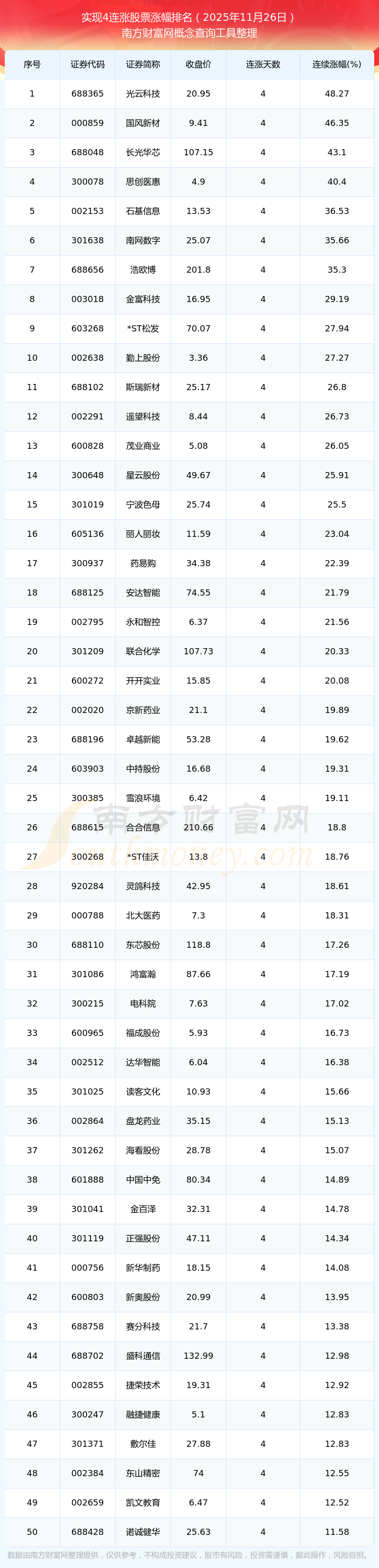 2025年11月26日實(shí)現(xiàn)4連漲股票漲幅排名