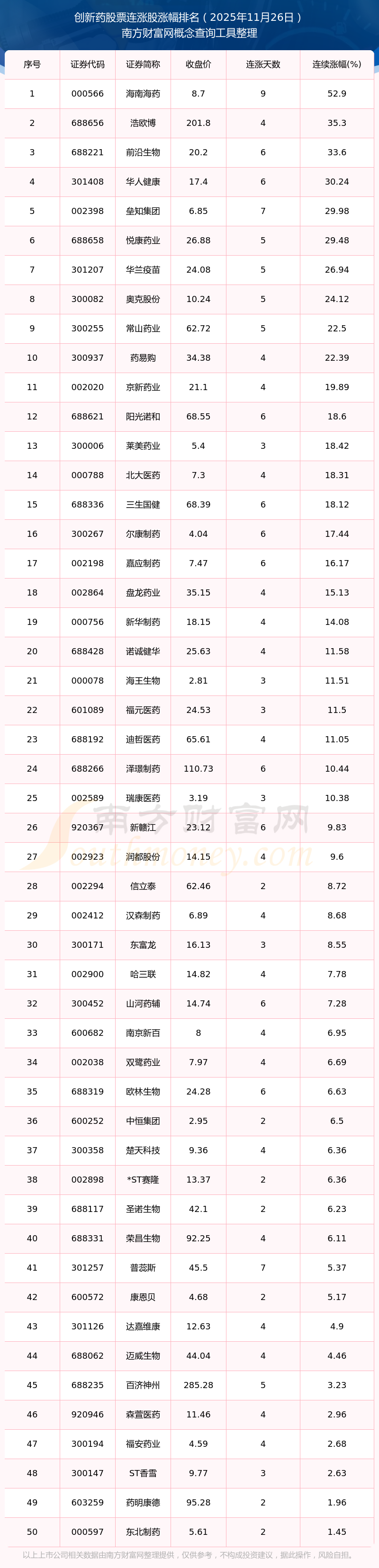 根據(jù)南方財富網(wǎng)概念查詢工具數(shù)據(jù)統(tǒng)計,截止2025年11月26日收盤,創(chuàng)新藥股票共有107只個股實現(xiàn)連漲。其中連續(xù)漲幅較大的個股有海南海藥、浩歐博、前沿生物等,連續(xù)漲幅分別為52.90%、35.30%、33.60%。