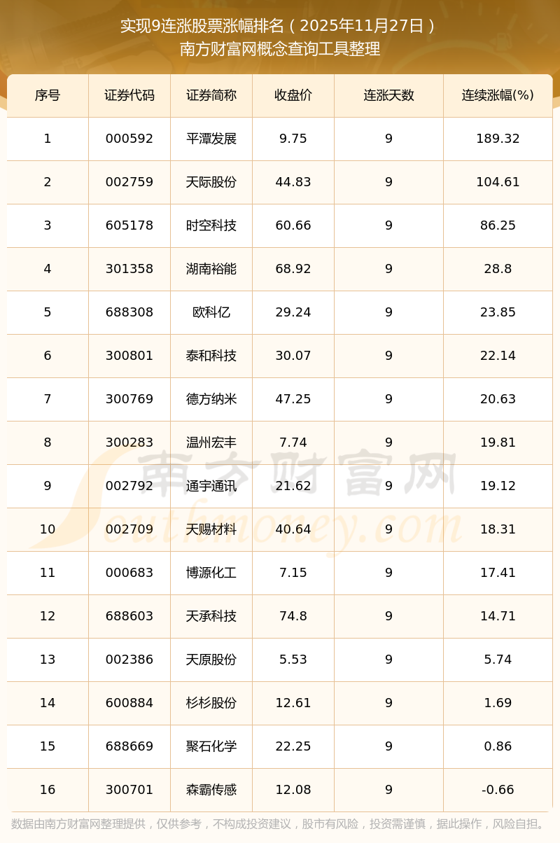 2025年11月27日實(shí)現(xiàn)9連漲股票漲幅排名