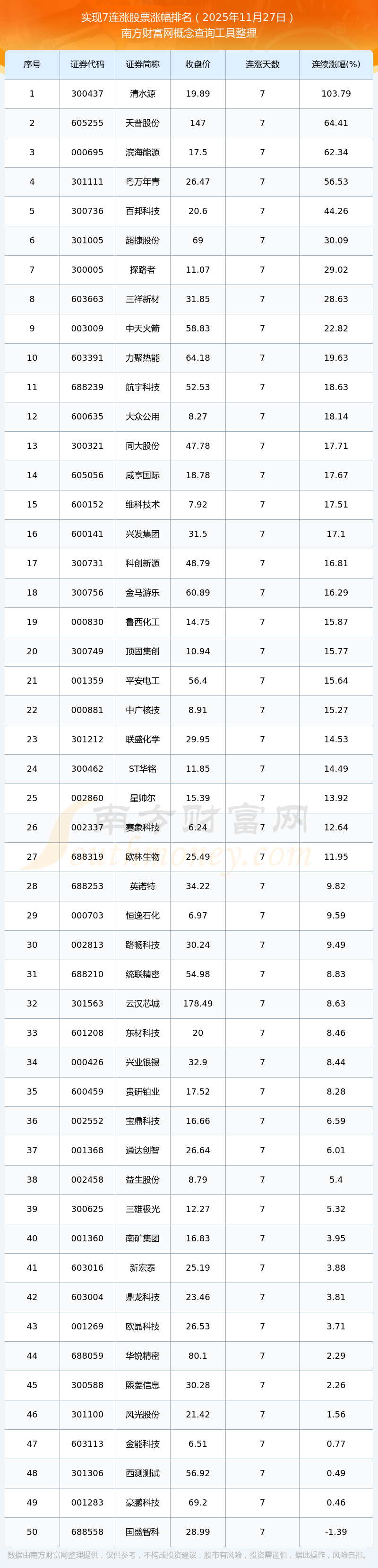 2025年11月27日實現(xiàn)7連漲股票漲幅排名