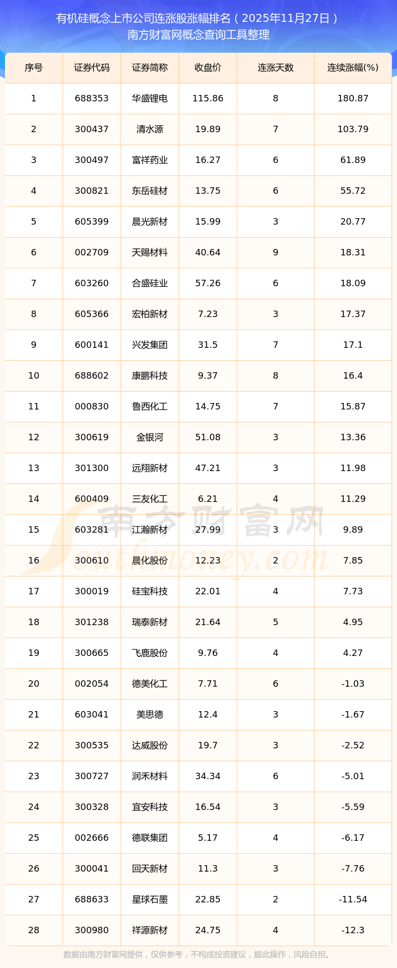2025年11月27日有機(jī)硅概念上市公司連漲股漲幅排名
