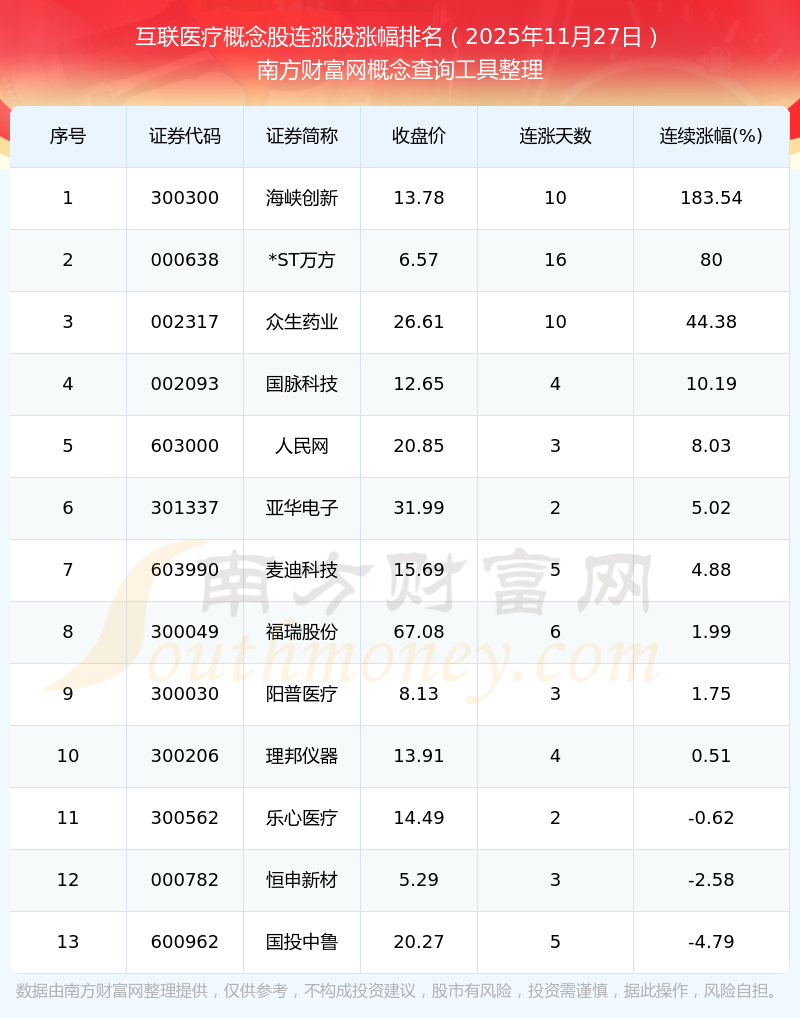 根據(jù)南方財(cái)富網(wǎng)概念查詢工具數(shù)據(jù)統(tǒng)計(jì),截止2025年11月27日收盤,互聯(lián)醫(yī)療概念股共有13只個(gè)股實(shí)現(xiàn)連漲。其中連續(xù)漲幅較大的個(gè)股有海峽創(chuàng)新、*ST萬(wàn)方、眾生藥業(yè)等,連續(xù)漲幅分別為183.54%、80.00%、44.38%。