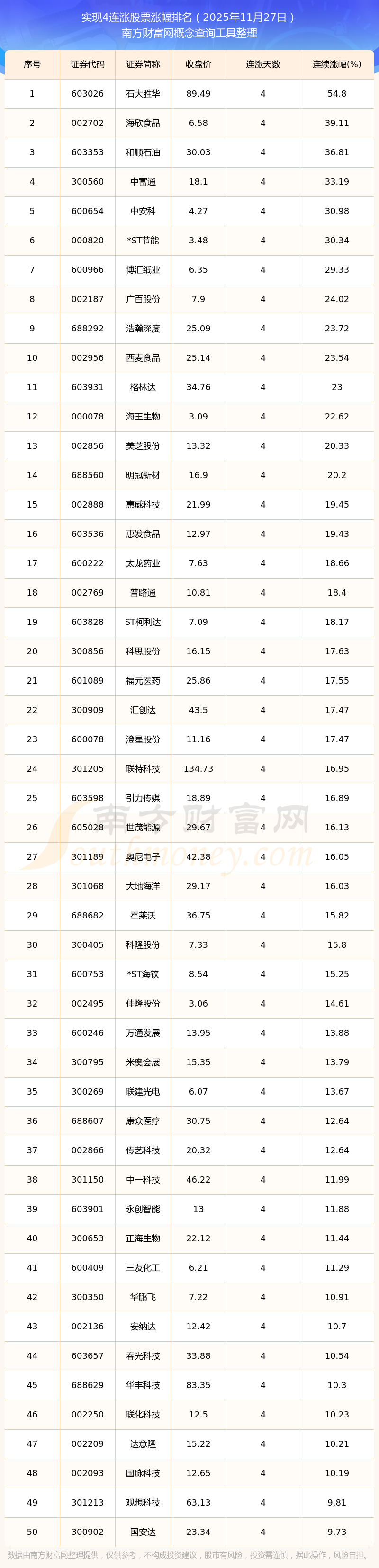根據(jù)南方財(cái)富網(wǎng)概念查詢工具數(shù)據(jù)統(tǒng)計(jì),截止2025年11月27日收盤,共有209只個(gè)股實(shí)現(xiàn)4天連漲。其中連續(xù)漲幅較大的個(gè)股有石大勝華、海欣食品、和順石油等,連續(xù)漲幅分別為54.80%、39.11%、36.81%。