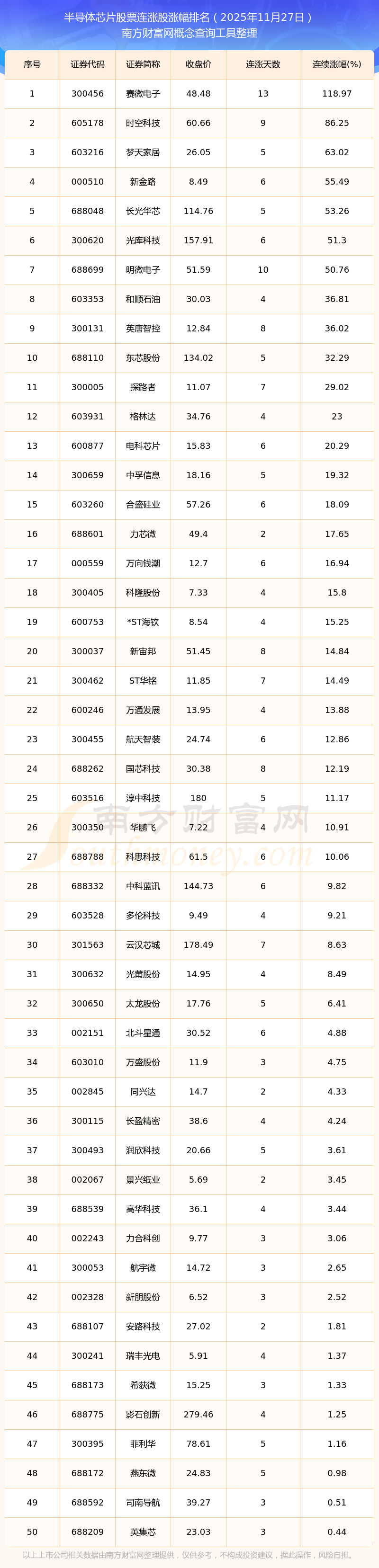 2025年11月27日半導(dǎo)體芯片股票連漲股漲幅排名