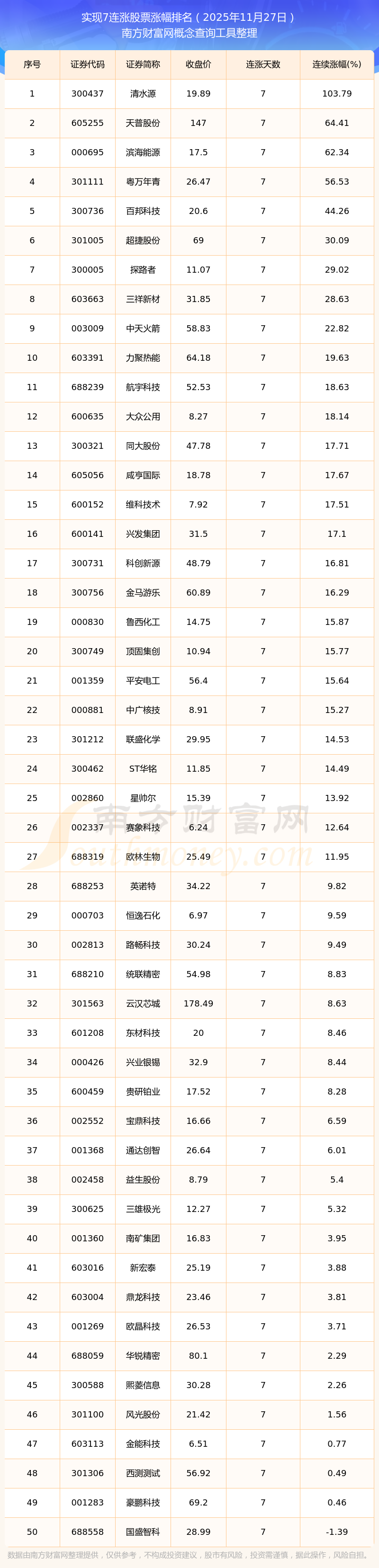 2025年11月27日實(shí)現(xiàn)7連漲股票漲幅排名