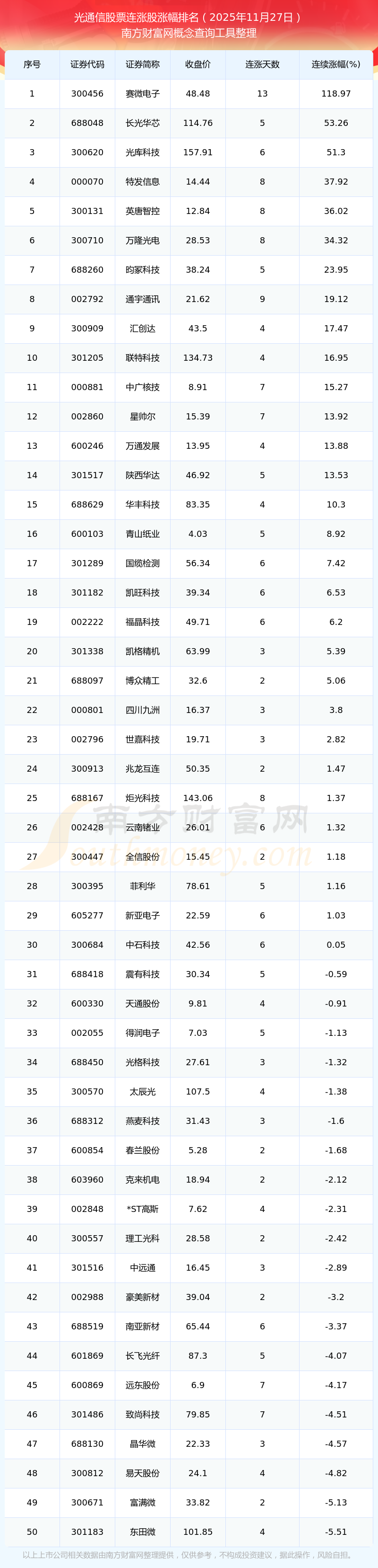 根據(jù)南方財(cái)富網(wǎng)概念查詢(xún)工具數(shù)據(jù)統(tǒng)計(jì),截止2025年11月27日收盤(pán),光通信股票共有62只個(gè)股實(shí)現(xiàn)連漲。其中連續(xù)漲幅較大的個(gè)股有賽微電子、長(zhǎng)光華芯、光庫(kù)科技等,連續(xù)漲幅分別為118.97%、53.26%、51.30%。