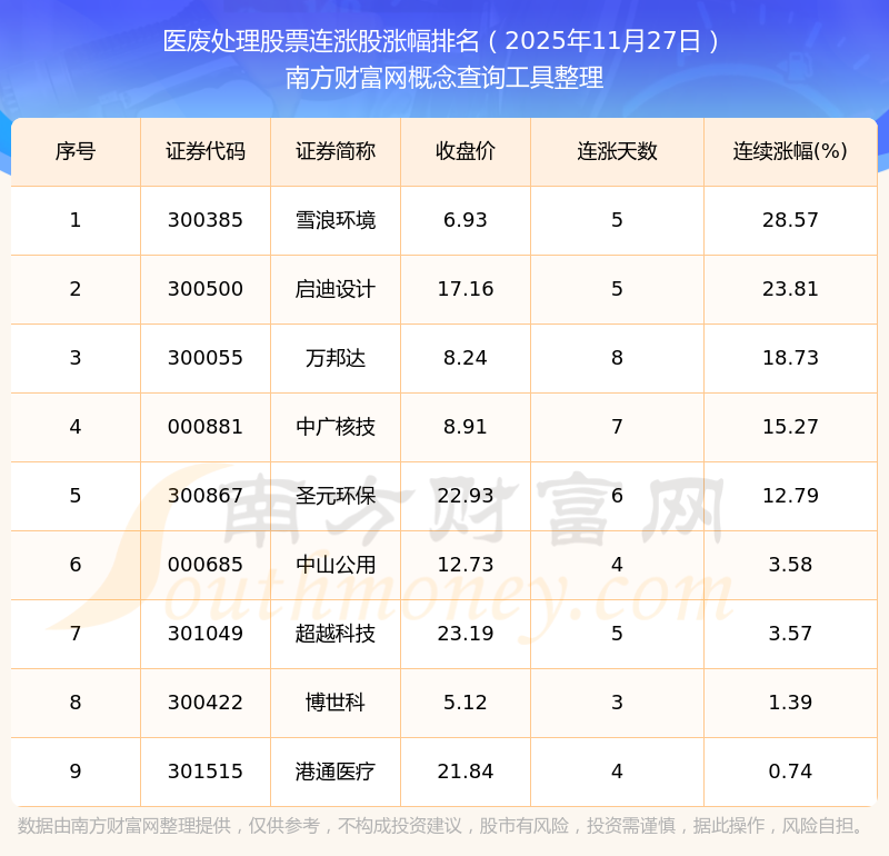 根據南方財富網概念查詢工具數據統計,截止2025年11月27日收盤,醫(yī)廢處理股票共有9只個股實現連漲。其中連續(xù)漲幅較大的個股有雪浪環(huán)境、啟迪設計、萬邦達等,連續(xù)漲幅分別為28.57%、23.81%、18.73%。