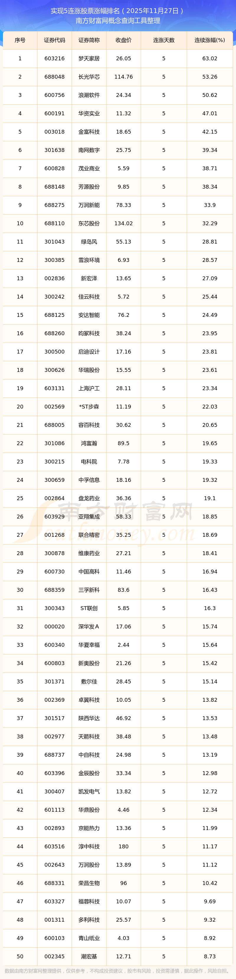 根據南方財富網概念查詢工具數據統計,截止2025年11月27日收盤,共有135只個股實現5天連漲。其中連續(xù)漲幅較大的個股有夢天家居、長光華芯、浪潮軟件等,連續(xù)漲幅分別為63.02%、53.26%、50.62%。