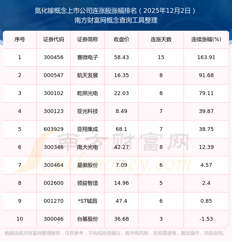 2025年12月2日氮化鎵概念上市公司連漲股漲幅排名