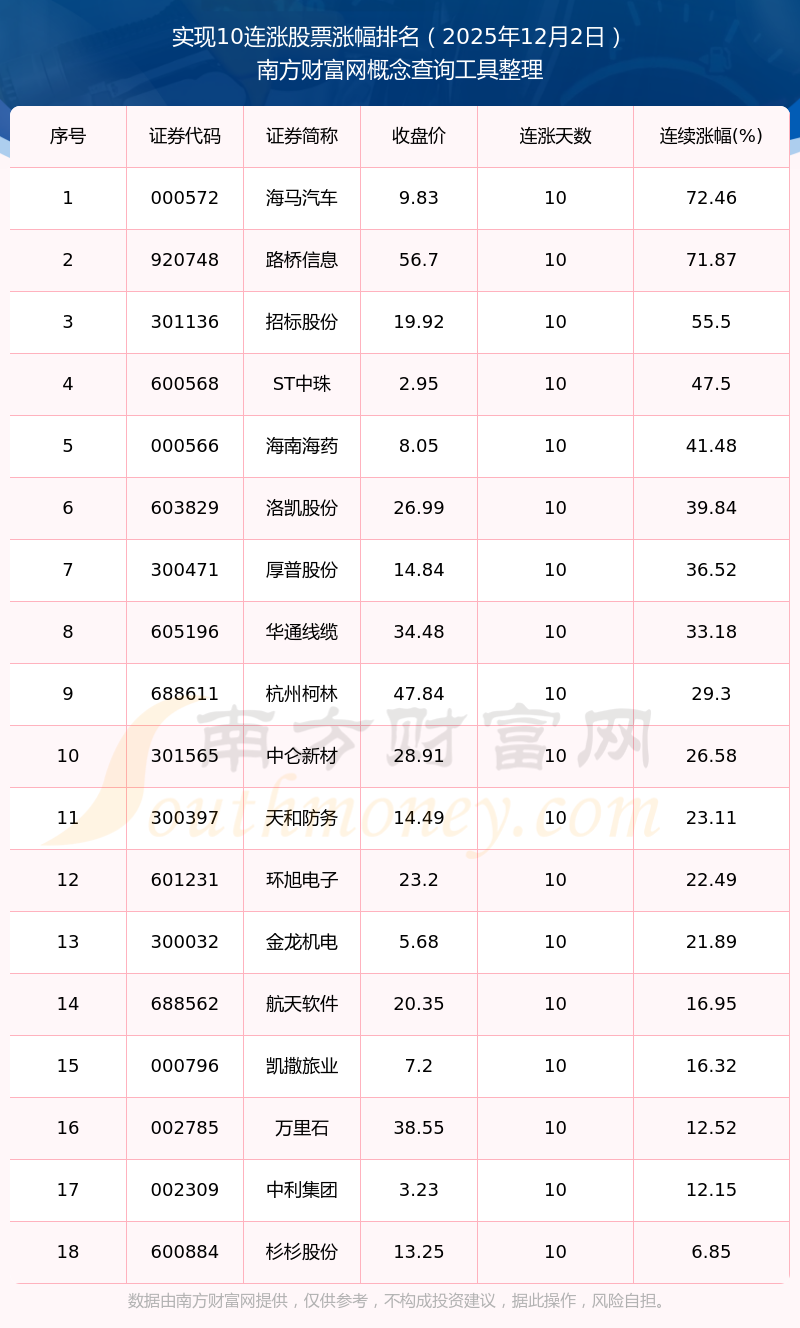 根據南方財富網概念查詢工具數據統(tǒng)計,截止2025年12月2日收盤,共有18只個股實現10天連漲。其中連續(xù)漲幅較大的個股有海馬汽車、路橋信息、招標股份等,連續(xù)漲幅分別為72.46%、71.87%、55.50%。