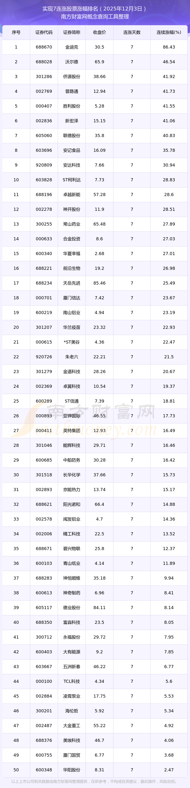 2025年12月3日實(shí)現(xiàn)7連漲股票漲幅排名