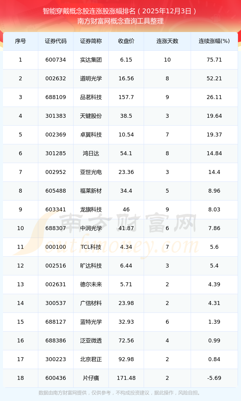 根據(jù)南方財富網(wǎng)概念查詢工具數(shù)據(jù)統(tǒng)計,截止2025年12月3日收盤,智能穿戴概念股共有18只個股實現(xiàn)連漲。其中連續(xù)漲幅較大的個股有實達集團、道明光學(xué)、品茗科技等,連續(xù)漲幅分別為75.71%、52.21%、26.11%。