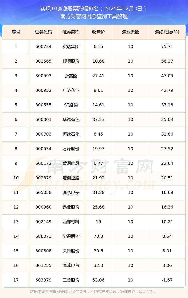 【今日股市行情】2025年12月3日17只股票實現(xiàn)10連漲!
