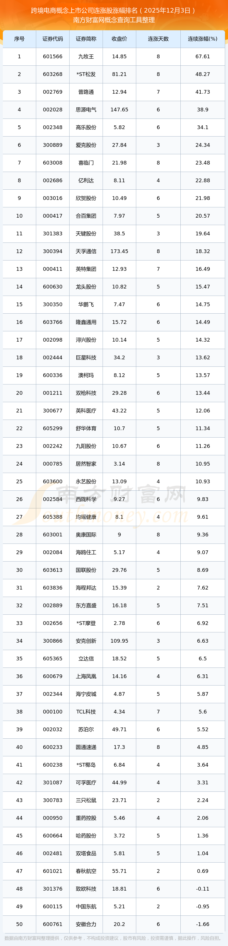 2025年12月3日跨境電商概念上市公司連漲股漲幅排名