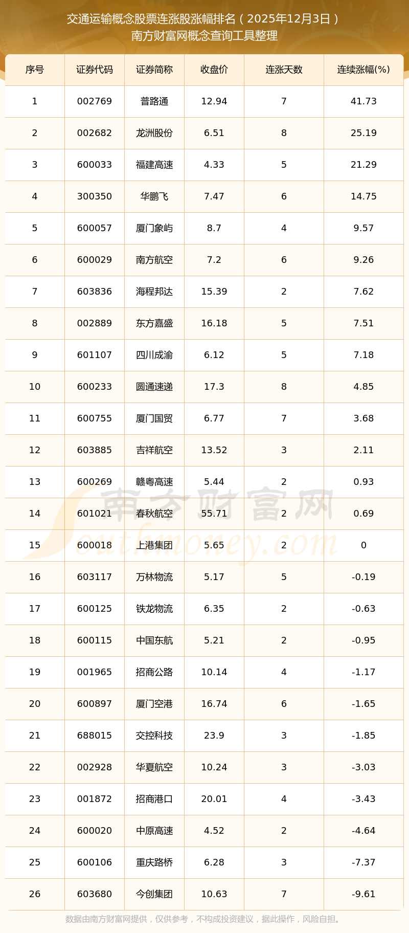 2025年12月3日交通運(yùn)輸概念股票連漲股漲幅排名