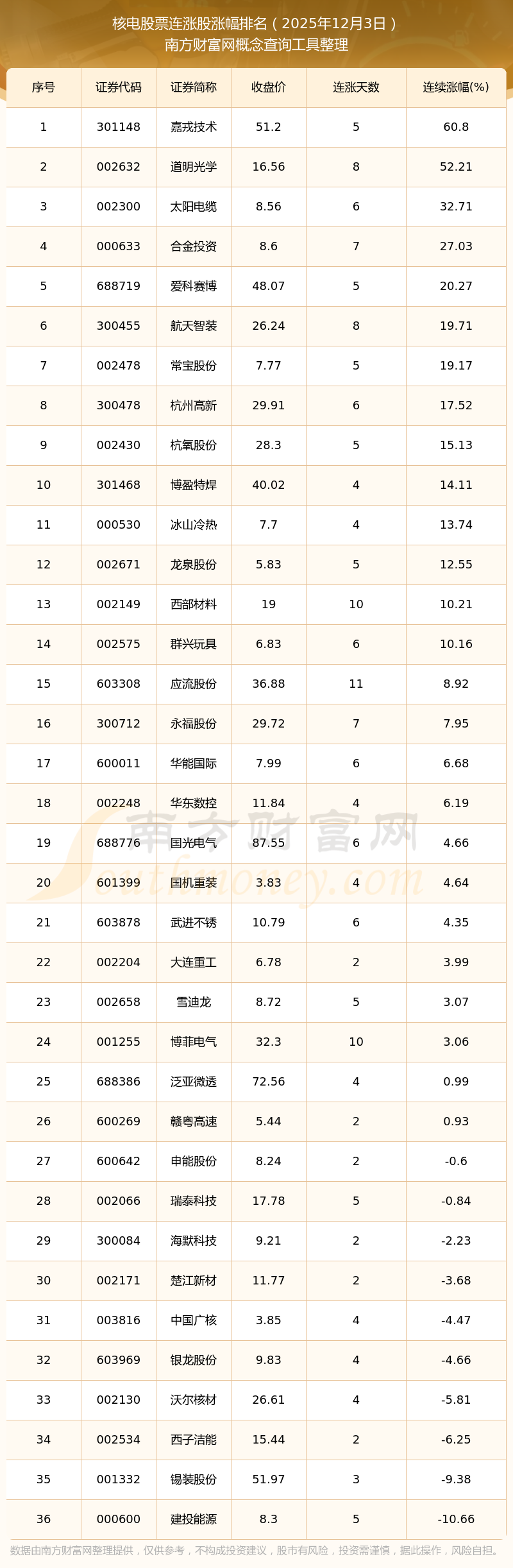 根據(jù)南方財(cái)富網(wǎng)概念查詢工具數(shù)據(jù)統(tǒng)計(jì),截止2025年12月3日收盤,核電股票共有36只個(gè)股實(shí)現(xiàn)連漲。其中連續(xù)漲幅較大的個(gè)股有嘉戎技術(shù)、道明光學(xué)、太陽電纜等,連續(xù)漲幅分別為60.80%、52.21%、32.71%。