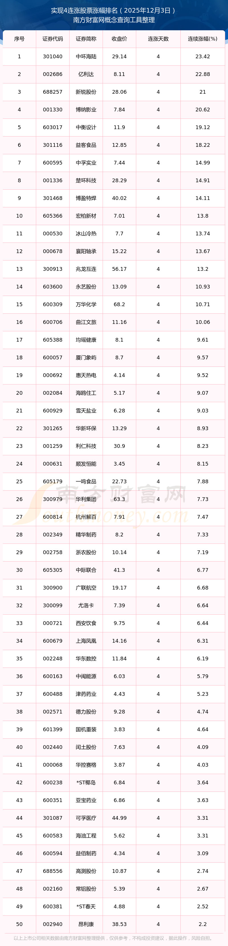 2025年12月3日實現(xiàn)4連漲股票漲幅排名