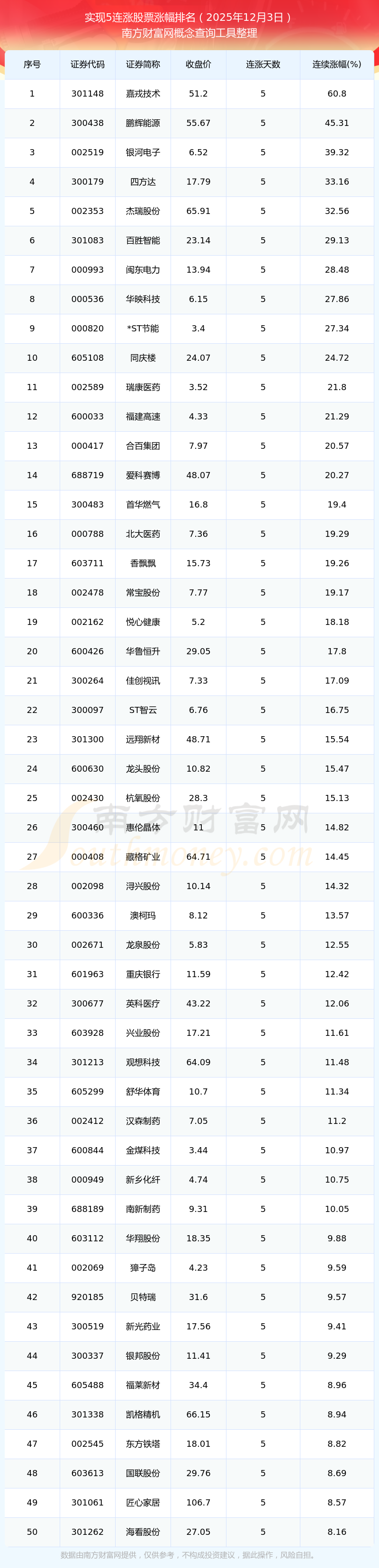 2025年12月3日實現(xiàn)5連漲股票漲幅排名