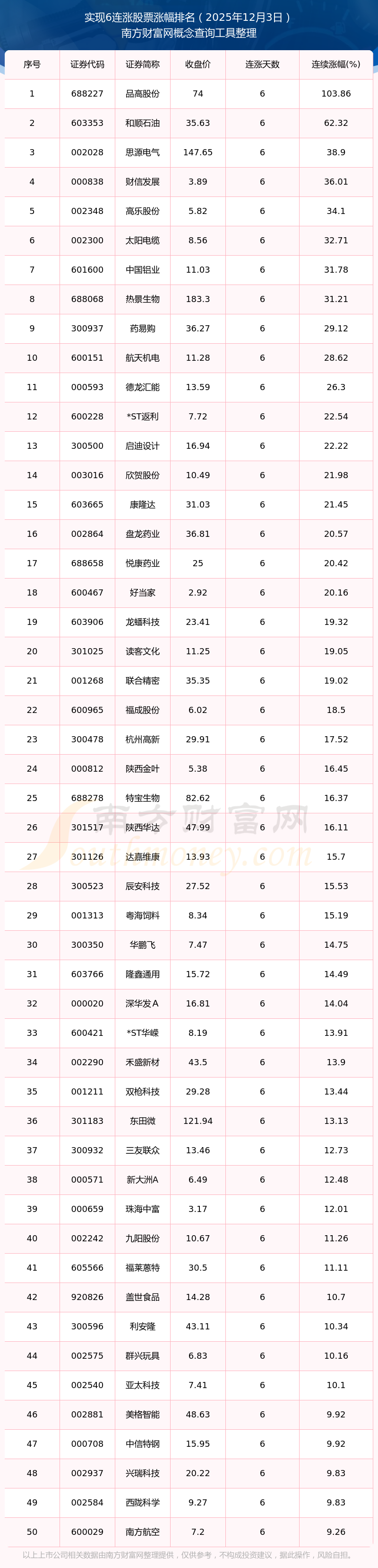 2025年12月3日實現(xiàn)6連漲股票漲幅排名