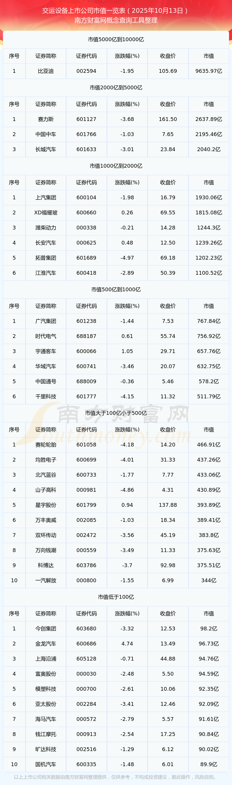 截止2025年10月13日,交運(yùn)設(shè)備上市公司中今創(chuàng)集團(tuán)、金龍汽車、國(guó)機(jī)汽車、保隆科技等59家市值位于不足100億之列;賽輪輪胎、均勝電子、北汽藍(lán)谷、星宇股份等29家市值位于100億到500億之列;廣汽集團(tuán)、宇通客車、華域汽車、千里科技等4家市值位于500億到1000億之列;上汽集團(tuán)、XD福耀玻、拓普集團(tuán)、江淮汽車等4家市值位于1000億到2000億之列;賽力斯、中國(guó)中車、長(zhǎng)城汽車等3家市值位于2000億到5000億之列。