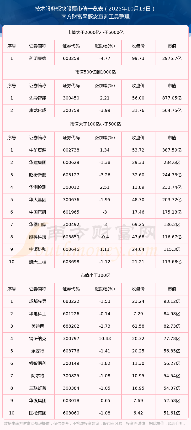 截止2025年10月13日,技術(shù)服務(wù)概念上市公司中成都先導(dǎo)、華電科工、美迪西、鋼研納克、永安行等38家市值位于不足100億之列;中礦資源、華建集團(tuán)、昭衍新藥、華測(cè)檢測(cè)等13家市值位于100億到500億之列;先導(dǎo)智能和康龍化成市值位于500億到1000億之列;藥明康德市值位于2000億到5000億之列。