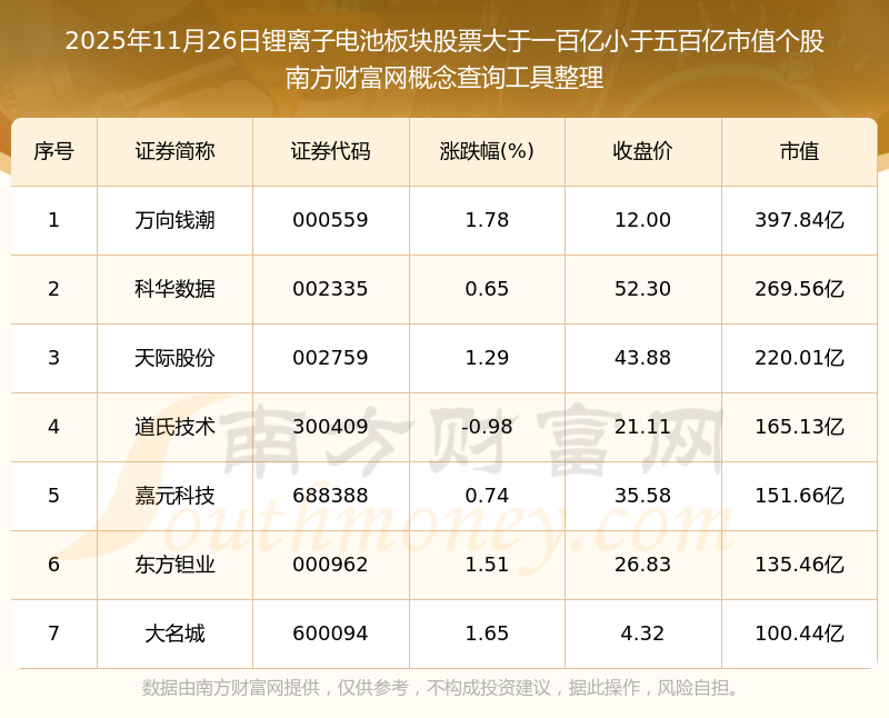 截止2025年11月26日,鋰離子電池板塊股票市值大于一百億小于五百億的個(gè)股共有7只。其中,市值較高的有萬(wàn)向錢(qián)潮、科華數(shù)據(jù)、天際股份,市值分別為397.84億元、269.56億元、220.01億元。