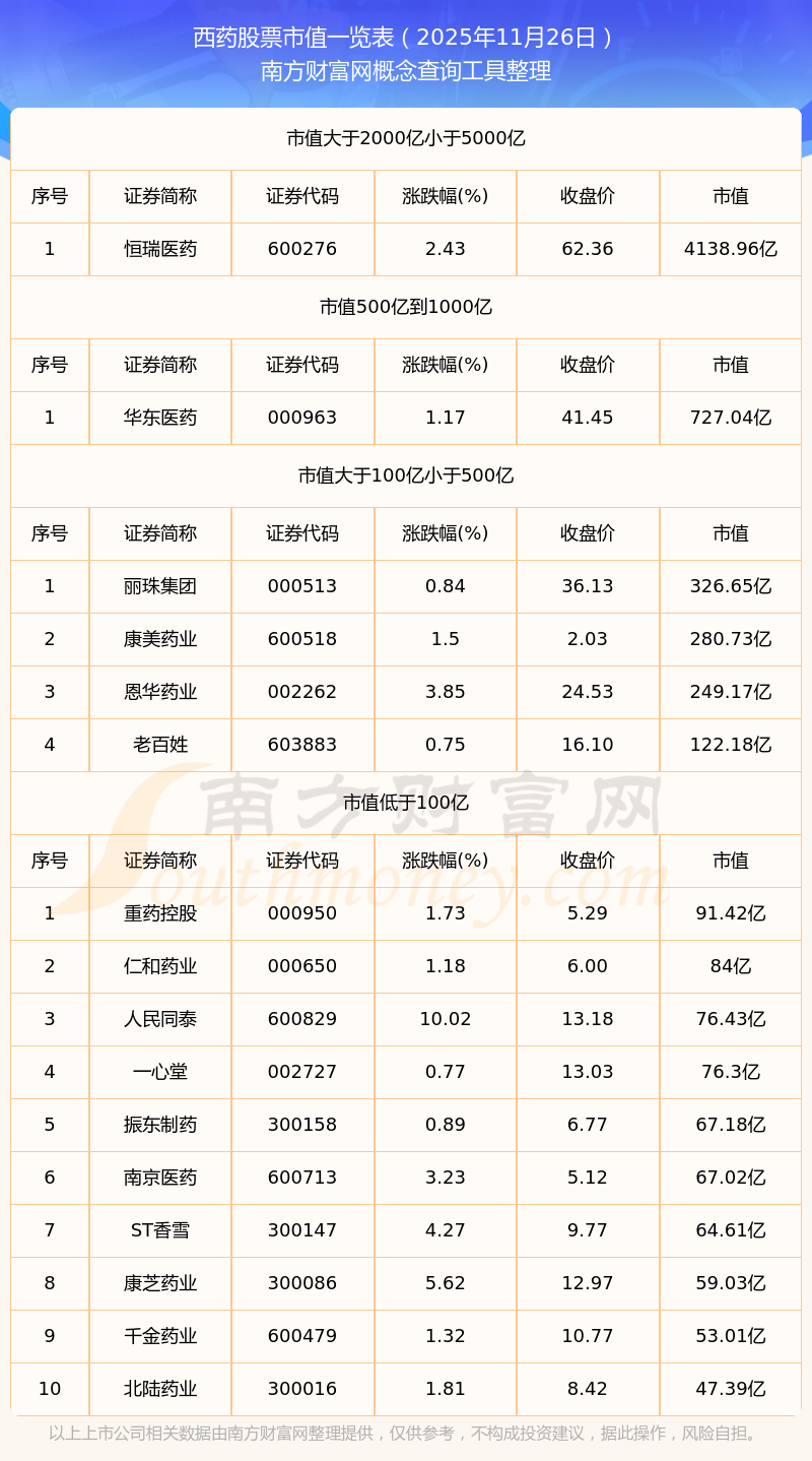 截止2025年11月26日,西藥概念股票中昆藥集團(tuán)、重藥控股、仁和藥業(yè)等26家市值位于不足100億之列;白云山、達(dá)仁堂、麗珠集團(tuán)等11家市值位于100億到500億之列;云南白藥、復(fù)星醫(yī)藥、華東醫(yī)藥、上海醫(yī)藥等4家市值位于500億到1000億之列;片仔癀市值位于1000億到2000億之列;恒瑞醫(yī)藥市值位于2000億到5000億之列。
