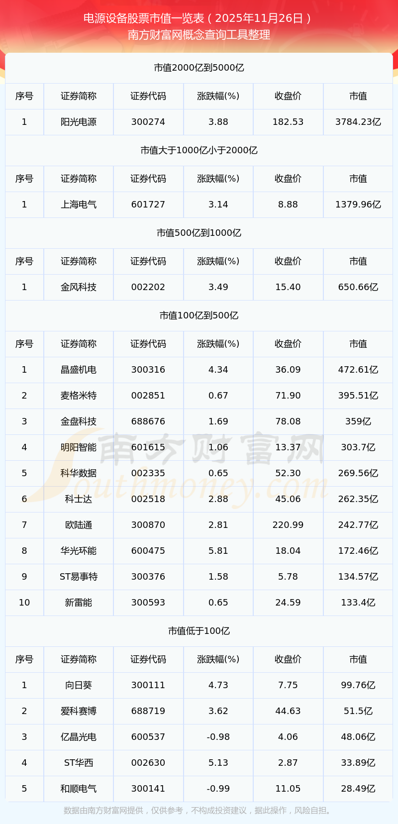 截止2025年11月26日,電源設(shè)備股票中中信博、科泰電源、華寶新能等41家市值位于不足100億之列;晶盛機(jī)電、天合光能、麥格米特、晶澳科技等38家市值位于100億到500億之列;東方電氣、國軒高科、金風(fēng)科技等6家市值位于500億到1000億之列;國電南瑞、億緯鋰能、隆基綠能、上海電氣等6家市值位于1000億到2000億之列;陽光電源市值位于2000億到5000億之列;寧德時(shí)代市值位于大于10000億之列。