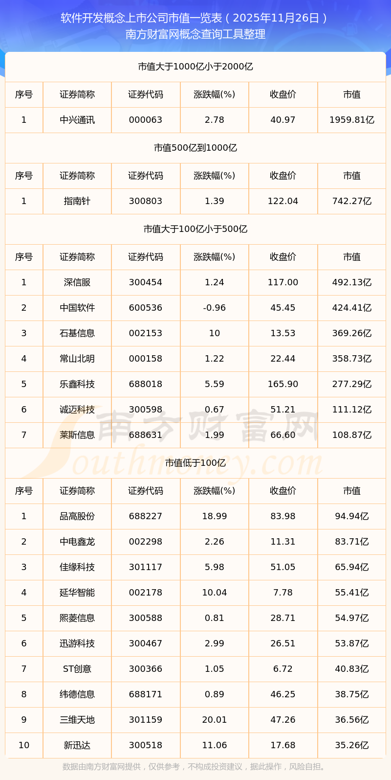 截止2025年11月26日,軟件開發(fā)概念上市公司中品高股份、福昕軟件、索辰科技、卓易信息等67家市值位于不足100億之列;用友網(wǎng)絡(luò)、中國軟件、柏楚電子、常山北明等27家市值位于100億到500億之列;三六零、寶信軟件、恒生電子等3家市值位于500億到1000億之列;金山辦公市值位于1000億到2000億之列;中興通訊市值位于2000億到5000億之列;中國移動(dòng)市值位于大于10000億之列。