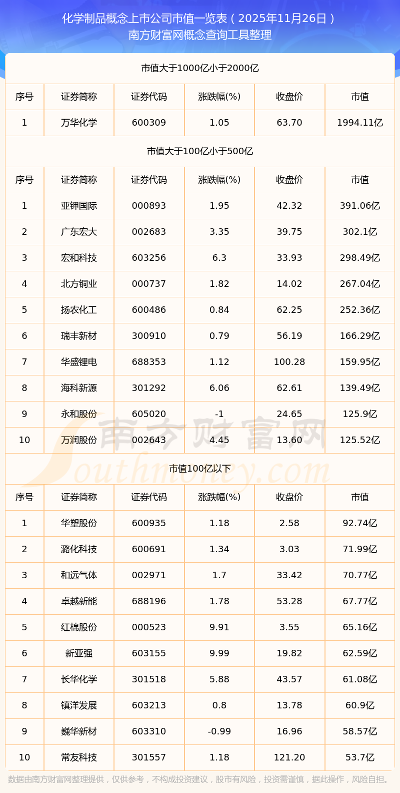 截止2025年11月26日,化學(xué)制品概念上市公司中華塑股份、江山股份、雪峰科技等70家市值位于不足100億之列;昊華科技、興發(fā)集團(tuán)、浙江龍盛等24家市值位于100億到500億之列;巨化股份、合盛硅業(yè)、中國巨石、華魯恒升等5家市值位于500億到1000億之列;萬華化學(xué)市值位于2000億到5000億之列。