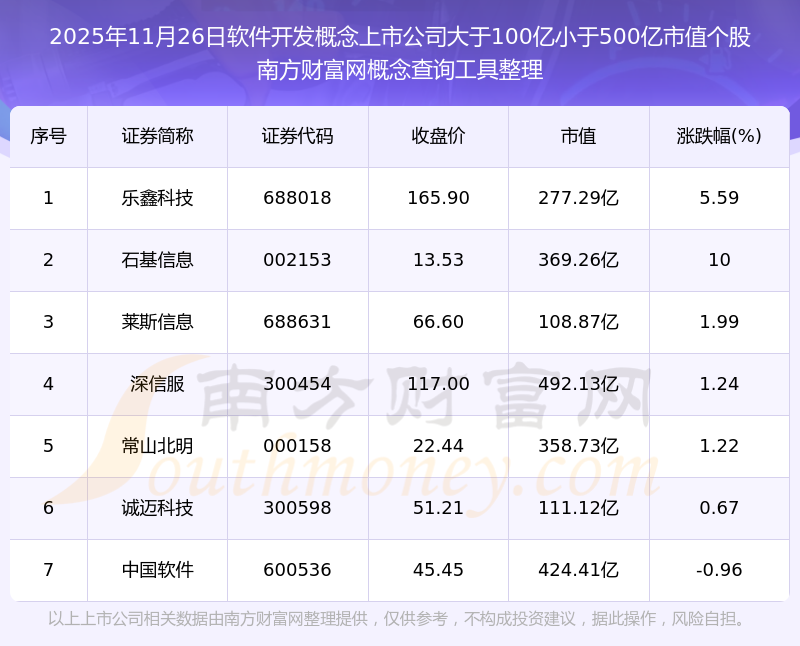 截止2025年11月26日,軟件開發(fā)概念上市公司市值大于100億小于500億的個(gè)股共有7只。其中,市值較高的有深信服、中國軟件、石基信息,市值分別為492.13億元、424.41億元、369.26億元。