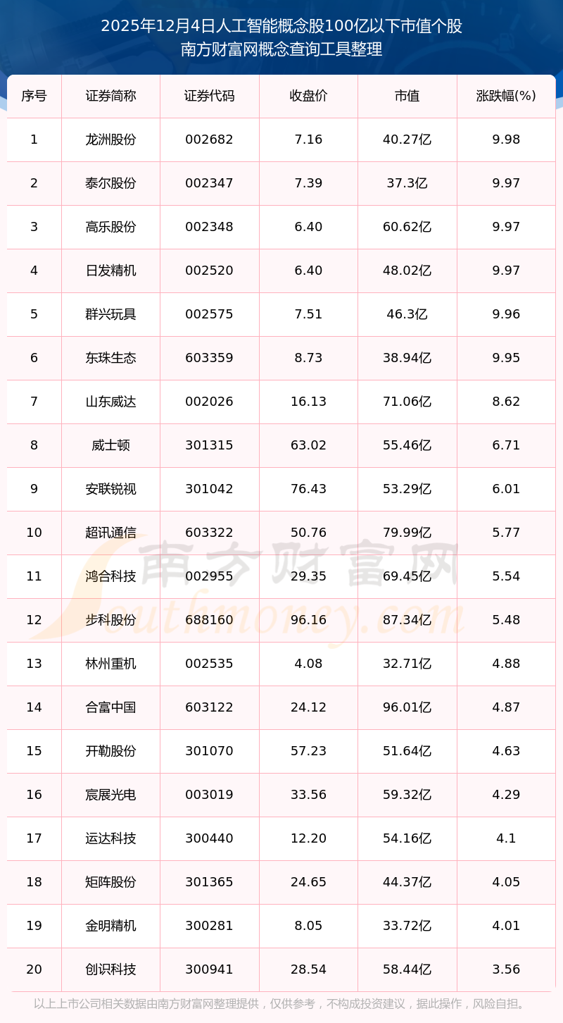 截止2025年12月4日,人工智能概念股市值100億以下的個股共有74只。其中,市值較高的有東湖高新、新媒股份、東杰智能,市值分別為99.69億元、97.74億元、96.1億元。