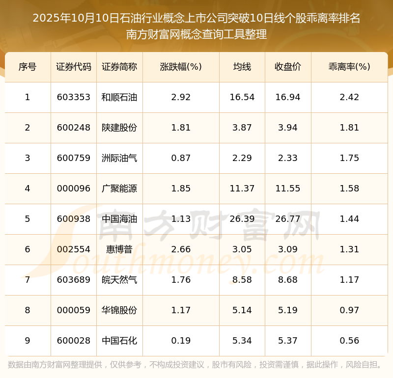 2025年10月10日石油行業(yè)概念上市公司突破10日線個(gè)股乖離率排名