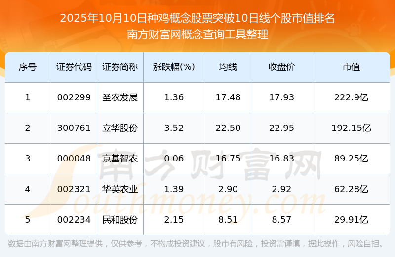 2025年10月10日種雞概念股票突破10日線個(gè)股市值排名