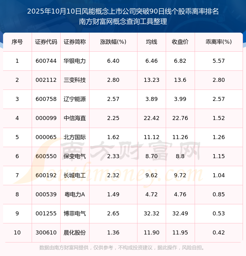 2025年10月10日風(fēng)能概念上市公司突破90日線個(gè)股乖離率排名