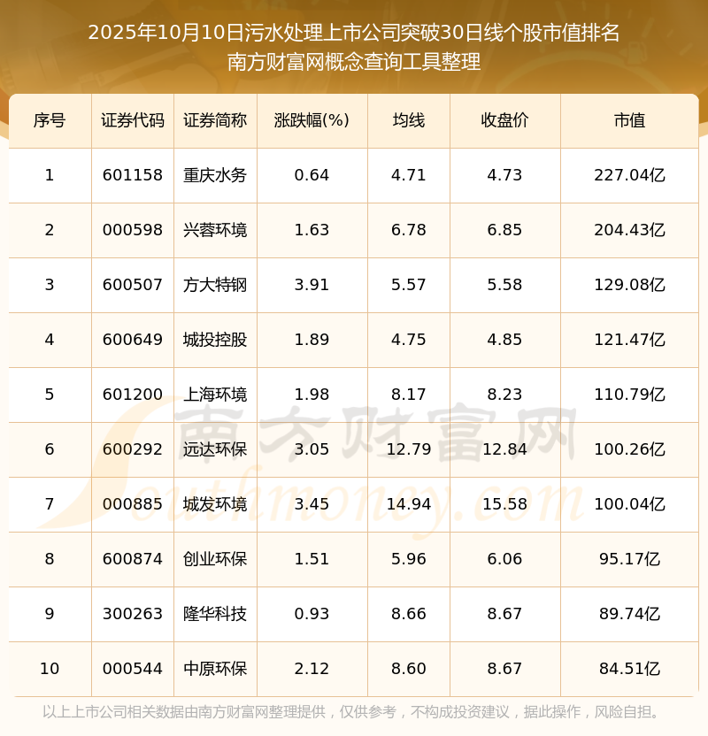 2025年10月10日污水處理上市公司突破30日線個(gè)股市值排名
