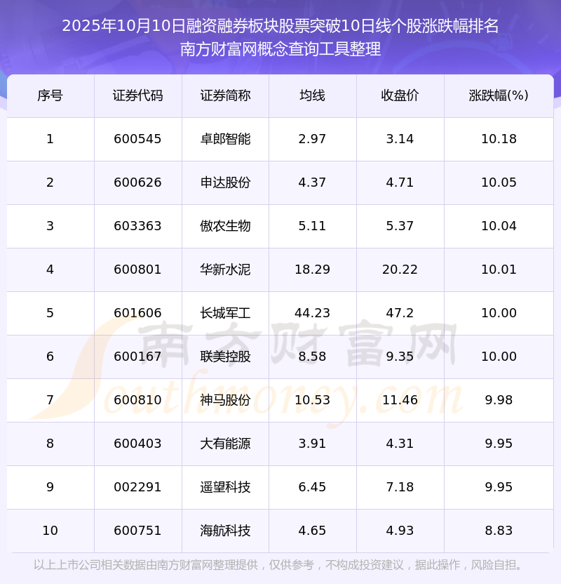 2025年10月10日融資融券板塊股票突破10日線(xiàn)個(gè)股漲跌幅排名