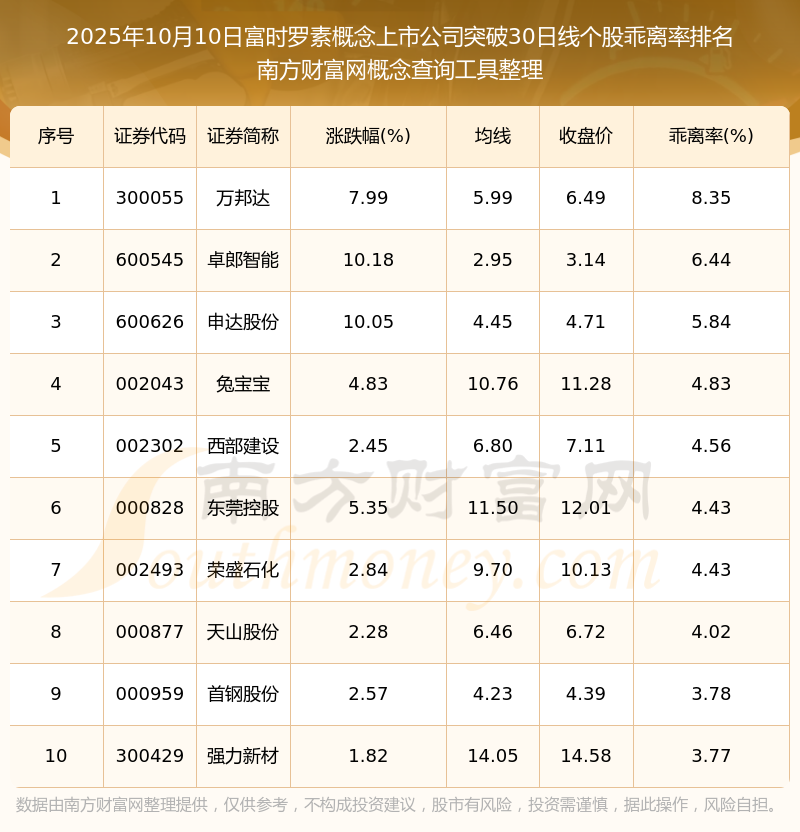 2025年10月10日富時羅素概念上市公司突破30日線個股乖離率排名