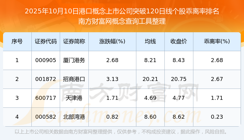 2025年10月10日港口概念上市公司突破120日線個(gè)股乖離率排名