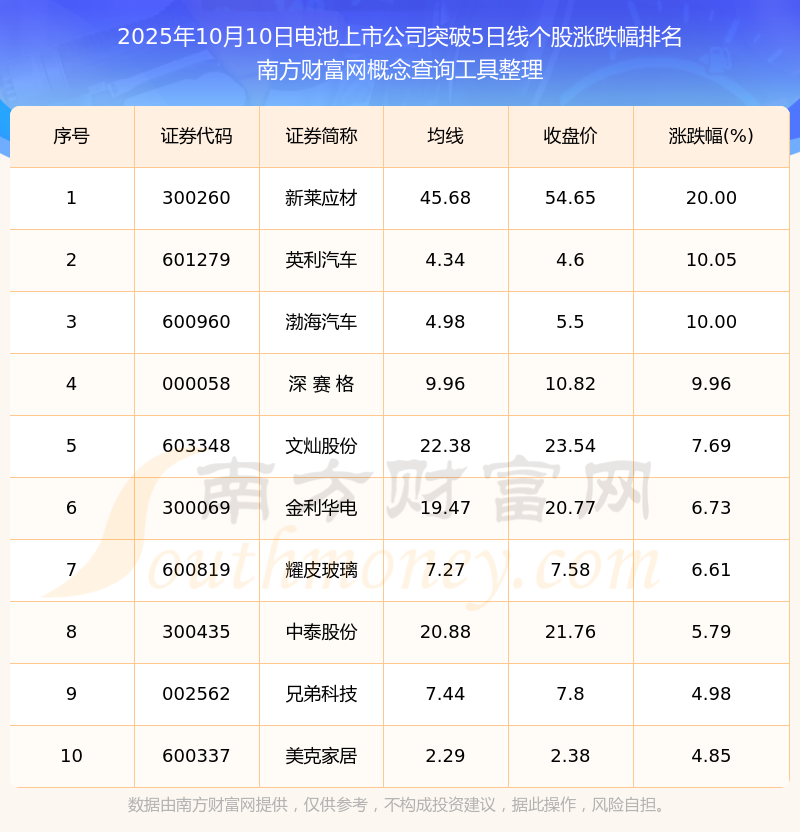 2025年10月10日電池上市公司突破5日線個(gè)股漲跌幅排名