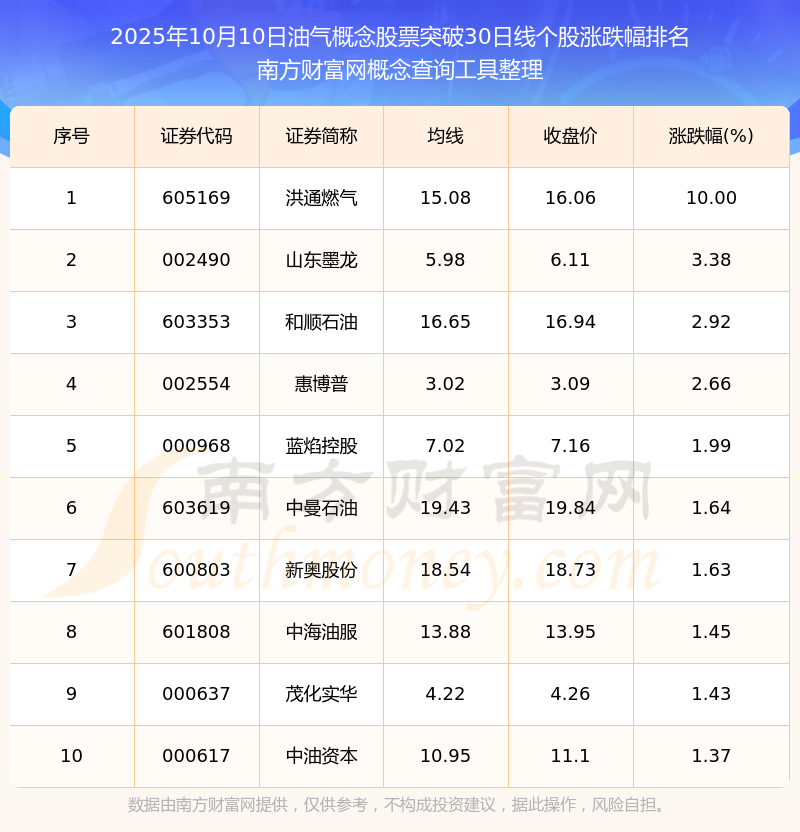 2025年10月10日油氣概念股票突破30日線個股漲跌幅排名