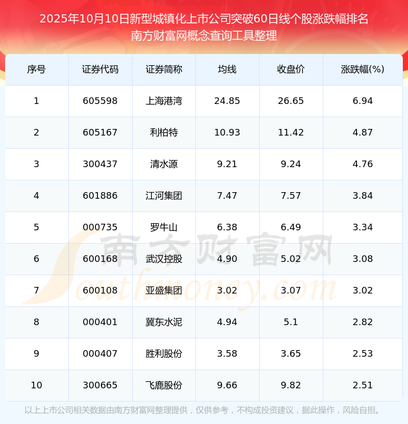 2025年10月10日新型城鎮(zhèn)化上市公司突破60日線個股漲跌幅排名